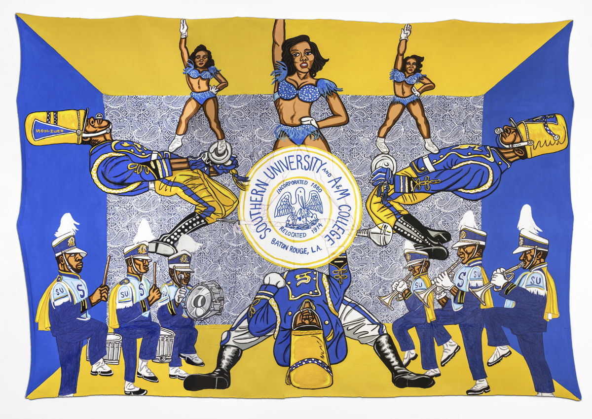 Battle of the Bands, Keith Duncan’s most recent body of work, celebrates the vibrant tradition of Historically Black College and University (HBCU) marching bands. This exhibition features large-scale fabric paintings of fifteen Southern HBCU bands, along with human-scale fabric paintings and smaller works on paper depicting each band’s drum major.