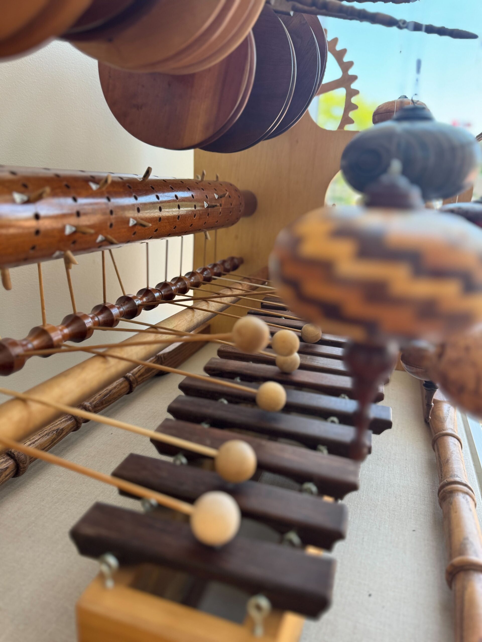 Experience the magic of movement and music with Musical Molinology, a captivating kinetic sculpture that combines craftsmanship, engineering, and artistic expression. Inspired by the study of molinology—the science of mills and mechanical devices powered by wind, water, animals, or human energy—this hand-cranked wonder sets a complex chain of wooden gears and shafts into motion. As the mechanism turns, thirteen cams lift and lower wands that raise delicate turned Christmas ornaments, while another gear triggers hammers to strike rosewood marimba bars, playing a melodic tune.