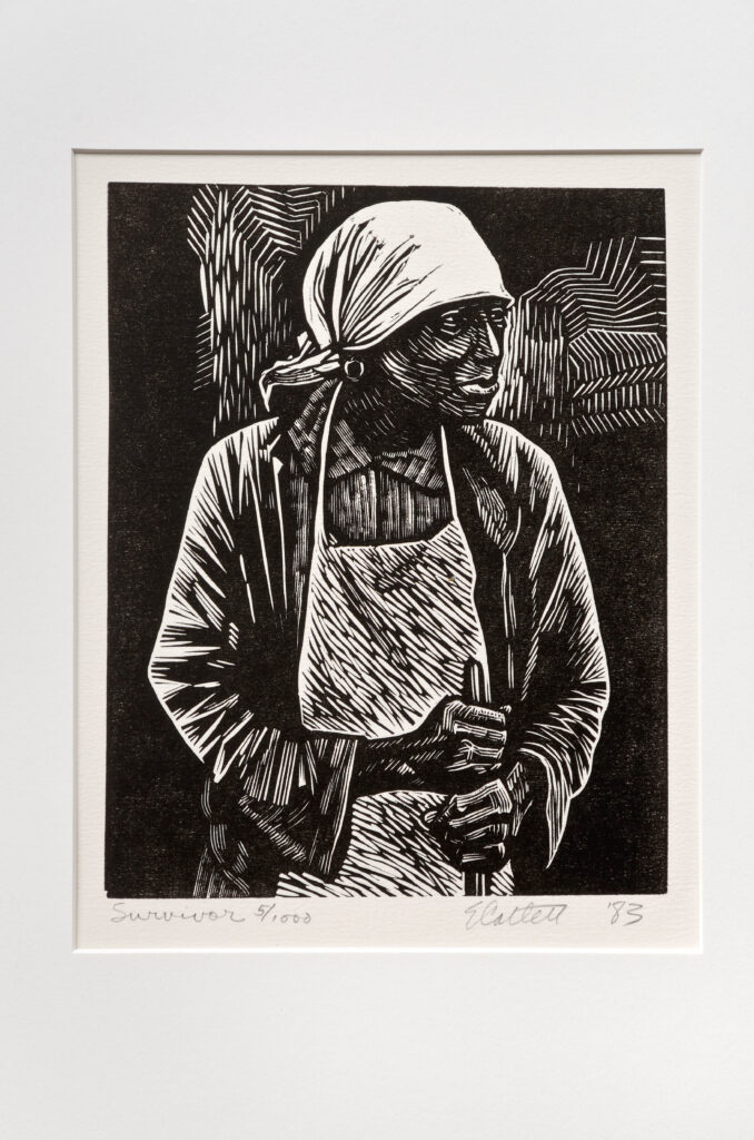 - Elizabeth Catlett, 1983, “Survivor”, woodcut, AP 11 x 10″ © 2026 Mora-Catlett Family / Licensed by VAGA at Artists Rights Society (ARS), NY