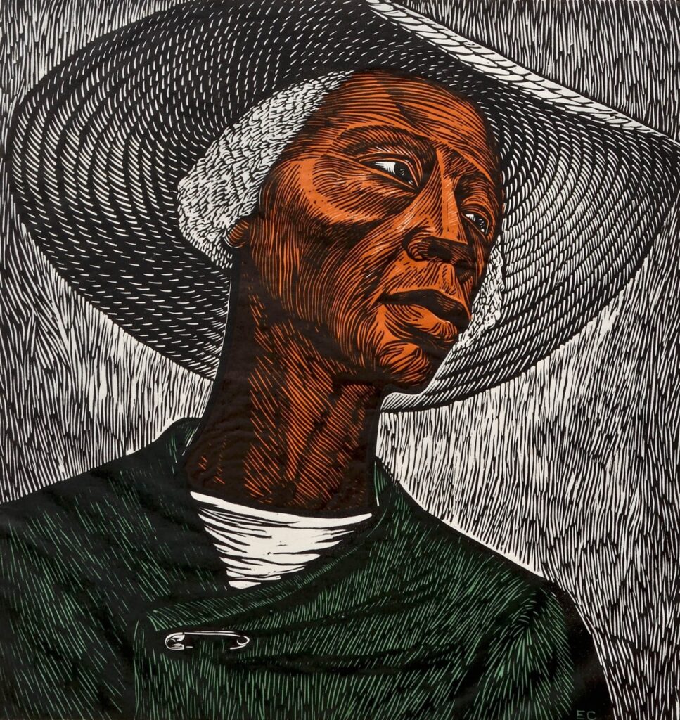 - Elizabeth Catlett, 1965, “Sharecropper”, linocut, AP 17 3/8 x 16 1/2″ © 2026 Mora-Catlett Family / Licensed by VAGA at Artists Rights Society (ARS), NY
